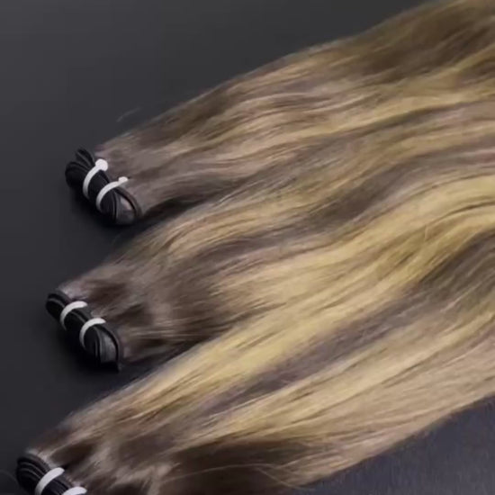 Hair details: Our warm highlight bundles are perfect for those who would like to try out a new colour thats not too risky. With the perfect warm and chocolate brown tones throughout and a pop or honey blond lowlights. Coloured to perfection these bundles will look great in many styles from sew ins, ponytails adding a pop of colour to your wig and more!